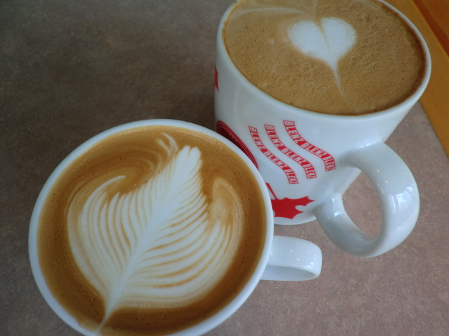 メニューはもちろん日本に合わせて変わっています。カフェラテはラテアートが施してあり、バナナケーキは日本仕様(たぶん)。メープルラテのカップにはカナダ模様が♪