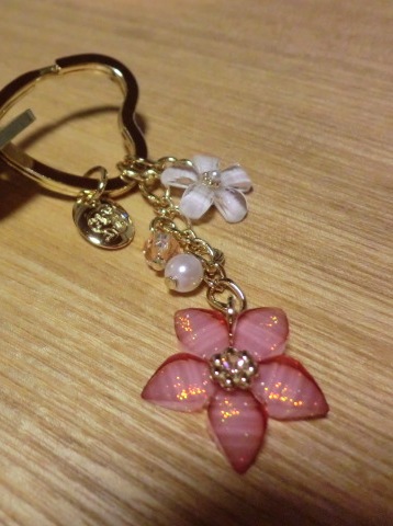 なので、自分で買おうと思っていたキーホルダーを買ってもらいました。アフタヌーンティのピンクと白のお花がついているものです。先日は同じデザインの緑と紫しか見つからなかったけれど、ちょうどピンクのがあったのでそれにしました。とっても可愛いです。しかし、あまりにささやかだったため夫はどうも納得がいっていなかったようです。