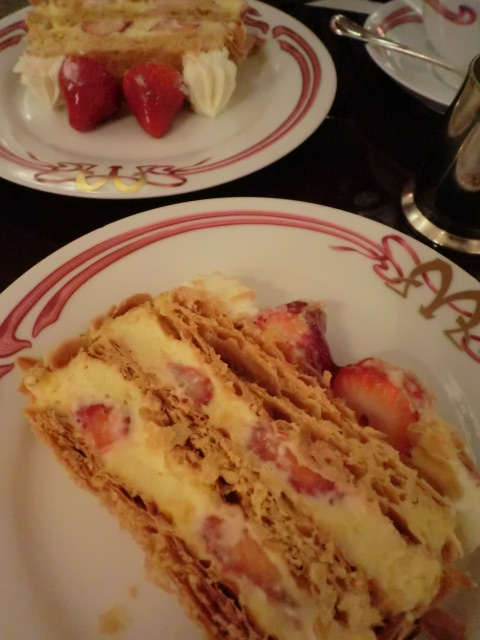 談笑しつつ、メインと前菜を食べ終わるといよいよデザートです。苺のミルフィーユです。思ったより一切れが大きい