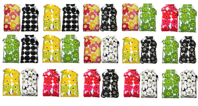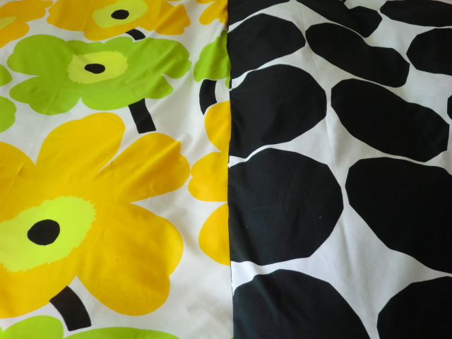 と、いうわけで、ネットから布団カバーの画像を拾って、ふたつずつに組み合わせて、それを並べて最終的には、夫にキヴェットkivet の黒を、私にウニッコの黄色を選びました。黄色は金運アップですね