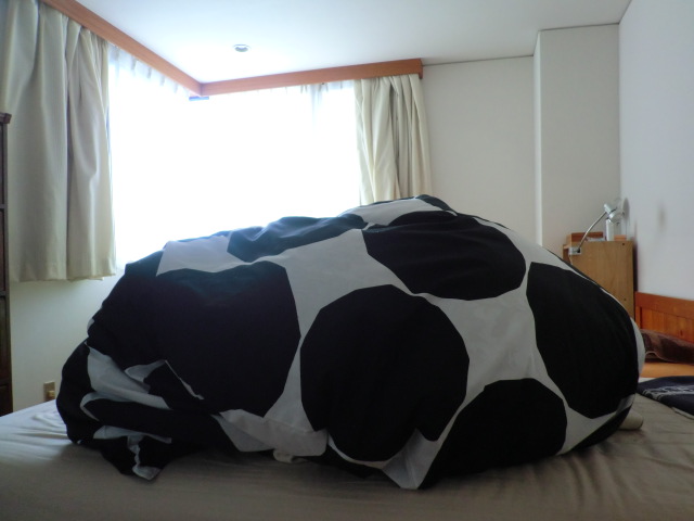 しかし、今日届いたカバーをつけた布団を見て、「思ったより目がチカチカしないね~」と安心したようでした。どうも花柄の布団で寝かされるのが怖かったようです。(それにしたって、あの水色のダサい布団よりはマシです)