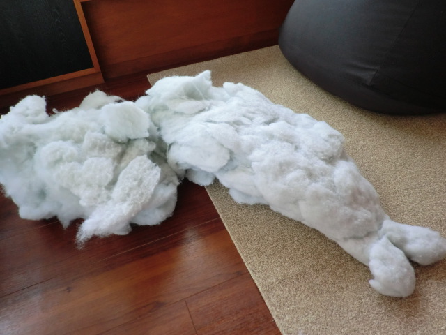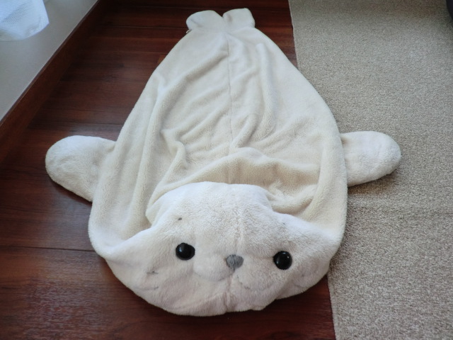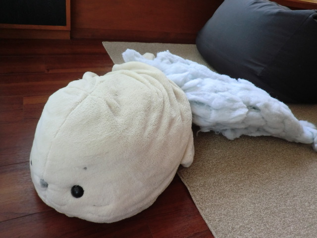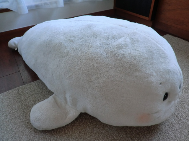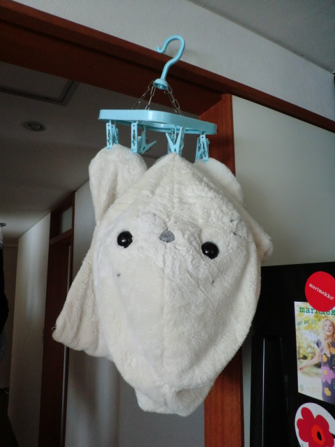 白いので、やっぱり汚れてしまって、今まで3回くらい丸洗いをしましたが、大きい(体長1メートル)なのでしっかり乾くまで時間がかかってしまい、干す場所を確保するのも結構大変で・・・