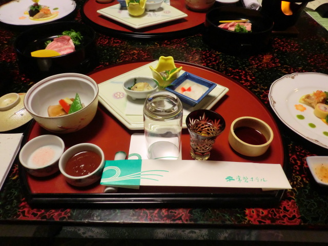 ホテルに着いてからのお食事は、部屋でいただくコースです。お風呂に入ってさっぱりしたところで始まったお食事ですが、準備ができた卓上を見て、ビックリしてしまいました。