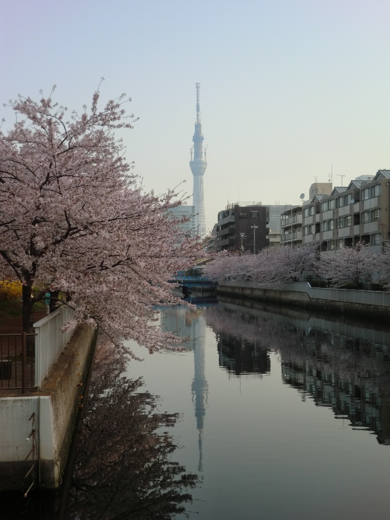 最近やたらと人がいるなぁ・・・と思っていた橋の上から見てみると、スカイツリー、桜、水面に映るスカイツリーと絶景ポイントであったことに気付き、せっかくなので写真を撮りました。みんなこれを撮っていたのですね。