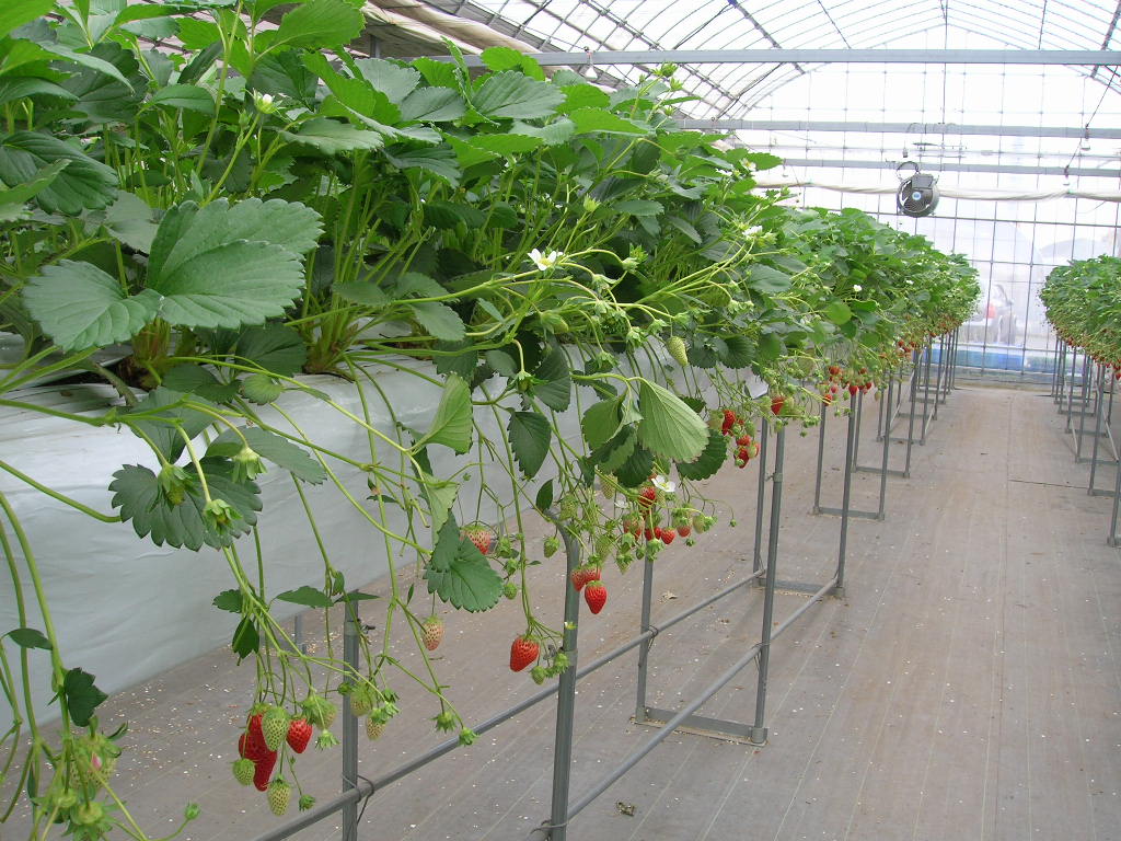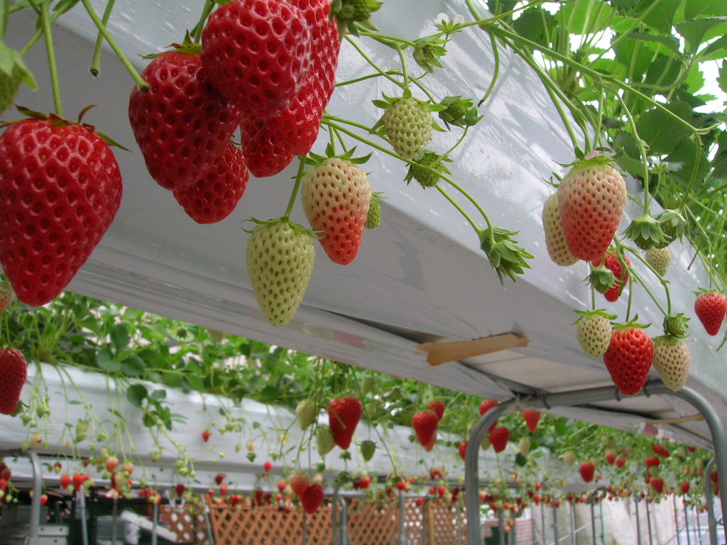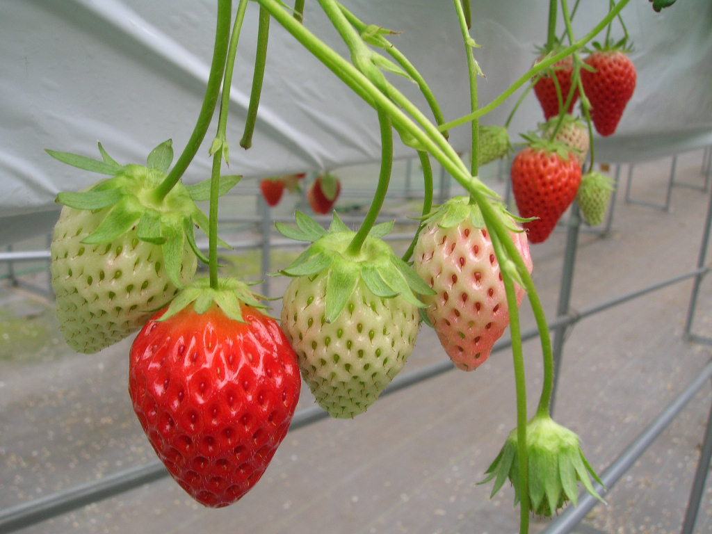 早速畑に入ると、かわいいいちごが両側に並んでいます。ちょうど腰の高さにぶら下がったいちご達。大きいの、小さいの、赤いの、白いの、まだ青いの、たくさんありました。わ~~い!!と思って食べ比べた結果、少し酸味がある紅ほっぺが美味しいと感じました。