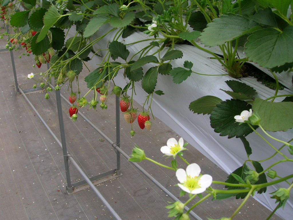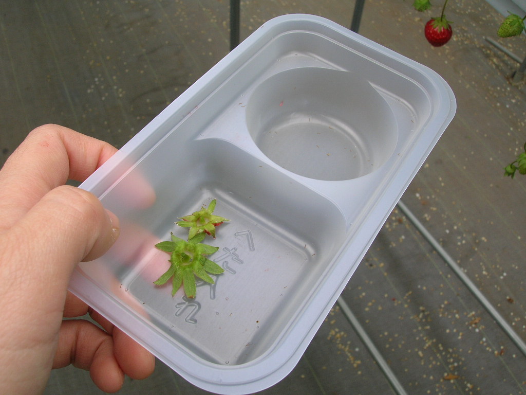 お金を払って受け取ったのは、いちごのへた入れのカップ(どうしても”へたれ”、と読めてしまう)、デザートのカップ、飲み物のカップ、ジェラート引換券。外は雨が降り始めましたが、ビニールハウスなので快適です。本日食べていい品種は、紅ほっぺとあきひめでした。