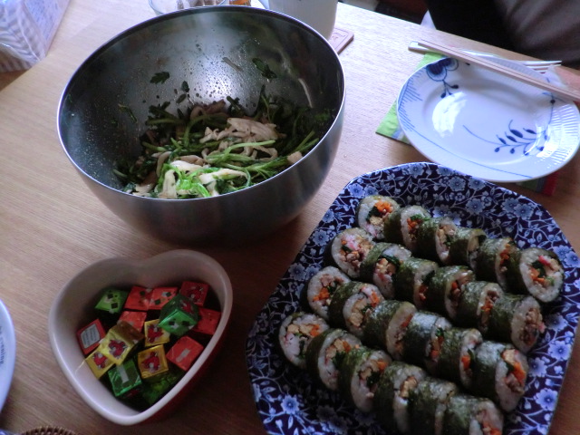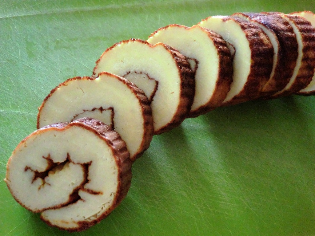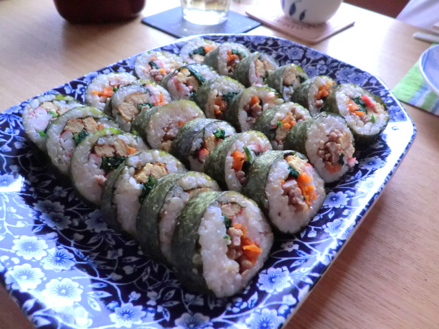 材料をミキサーに入れて、玉子焼き用フライパンで両面を焼いて、巻くだけです。巻くのは最近得意なので、くるくると巻いて、ゴムで留めて冷やして、切ってできあがり。味は良くわかりません。