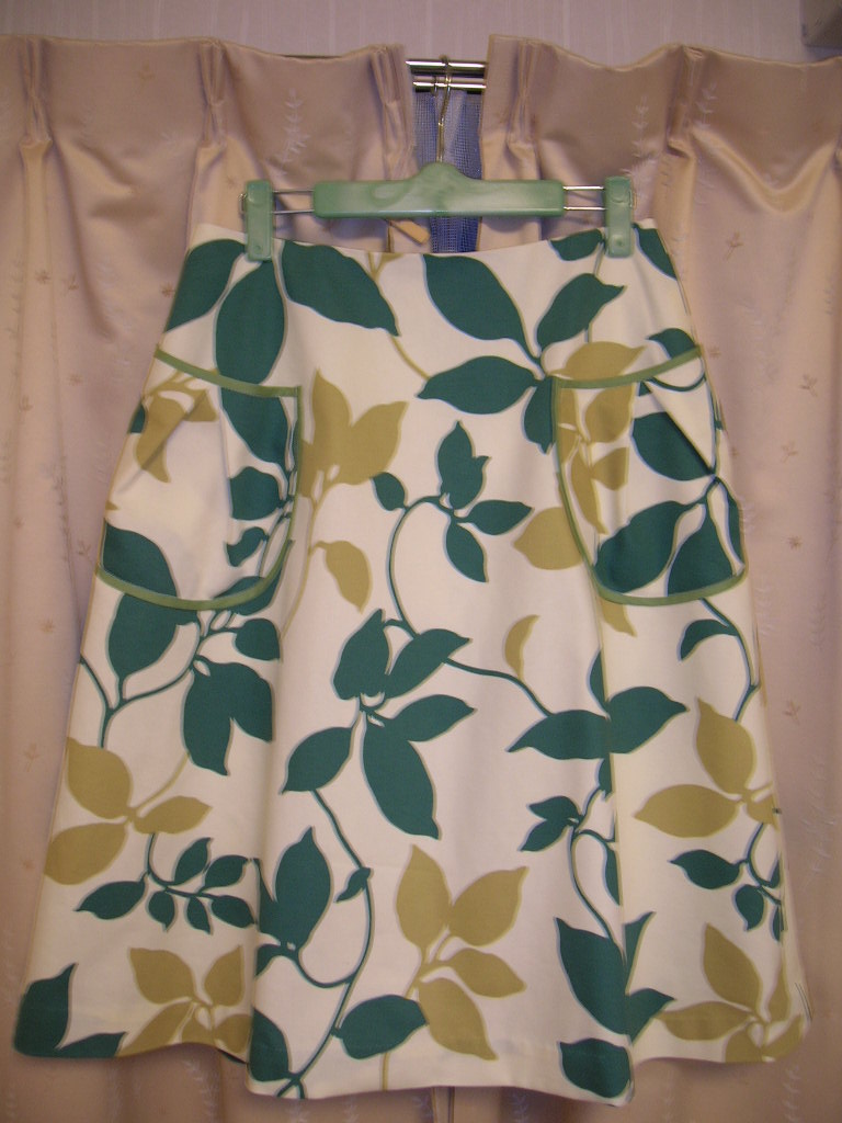 何だか曇ったような画像で色がハッキリ出ないのが残念ですが・・・。ベッドカバーのような柄の、ポケット付きのスカートです。材料費、3,000円くらいかな。
