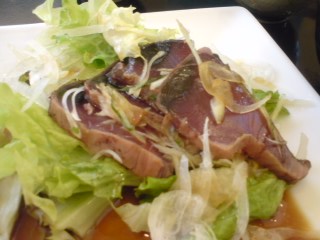 美味しかった・・・。大きく切ったカツオが5切れ。レタスと新タマネギのサラダの上に乗ったカツオに、ネギとしその細切りに醤油ドレッシングで味付け。今度やってみよう。