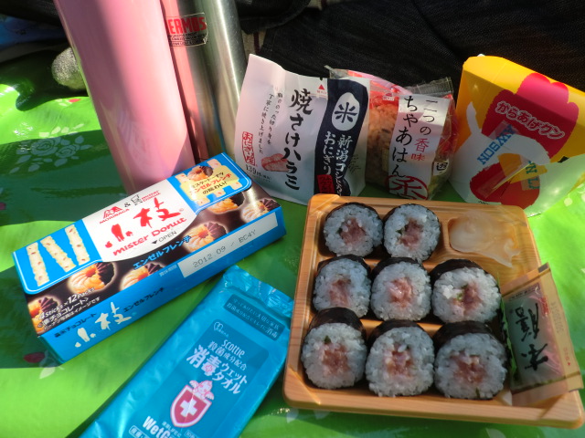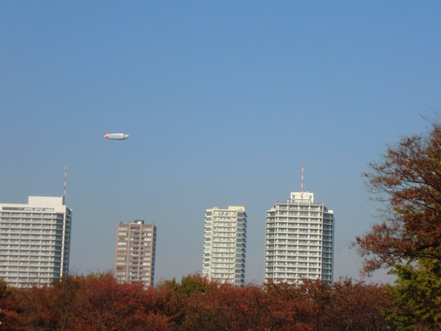 急に思い立ったのでお弁当を作る余裕が無く、お茶だけ水筒に詰めてお昼はローソンで調達。空には飛行船が浮かび、休日の雰囲気を盛り上げます。