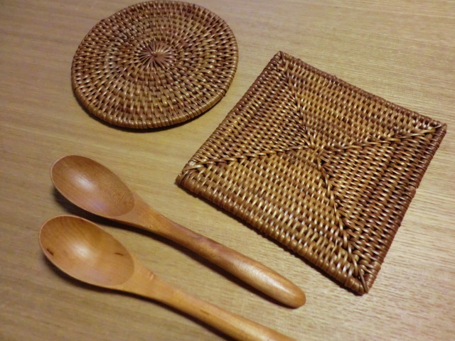 木のスプーンはたくさんありますが、気に入った形と色が合致することは珍しいことなのです。コースターも、角型はよく見かけたのですが、丸型を見るのは初めてでした。そして、嬉しくなって購入しました。