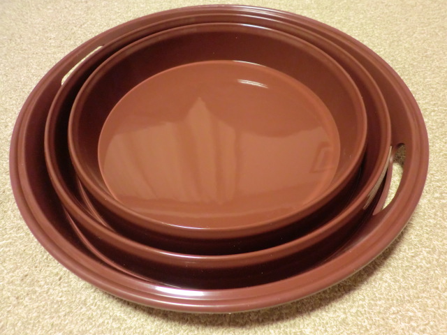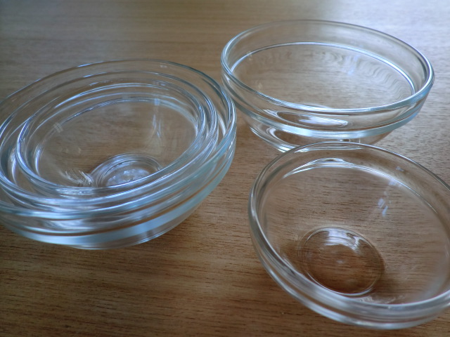 これこれ。ガラスのスタックボウルです。大きさが何種類もありますが、うちで愛用しているのは7.5cm、9cm、10cmの3種類です。調理中の調味料入れにぴったりだし(お料理番組でも使ってますね♪)、二つずつあれば、食卓でミニサラダにも使えます。以前行ったカフェでは、お漬物が入っていたり、紅茶の使用済みティバッグ入れにしていたりと用途いろいろ。大きさも10種類くらいあったと思いますが、全てきれいに重なるようになってます。前に買った時の値段は忘れましたが、今回は120円、140円、160円で買いました。