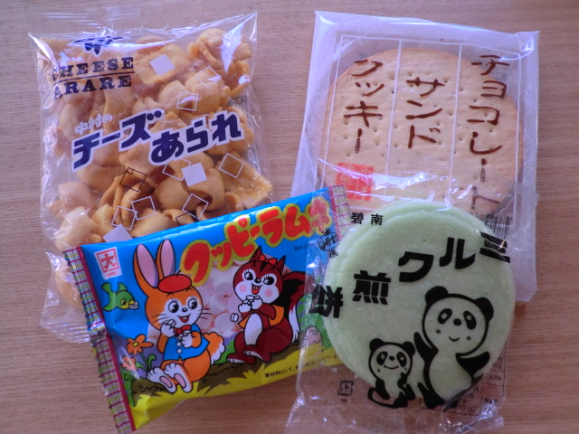 懐かしいチーズあられ、クッピーラムネ、侮れない美味さのチョコレートサンドクッキー、ゆるいパンダと身体に悪そうな色が魅力のミルク煎餅。