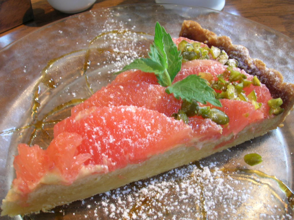 それにしても、私が気にいって何回も「美味しい美味しい」としつこく言ってしまったのは、ピンクグレープフルーツのタルトでした。1ピースが結構大きくて、アーモンド味ベースのタルトにぎっしり並んだピンクグレープフルーツに散らしたピスタチオ。美味しかった・・・・。タルト作りに挑戦したくなりました。