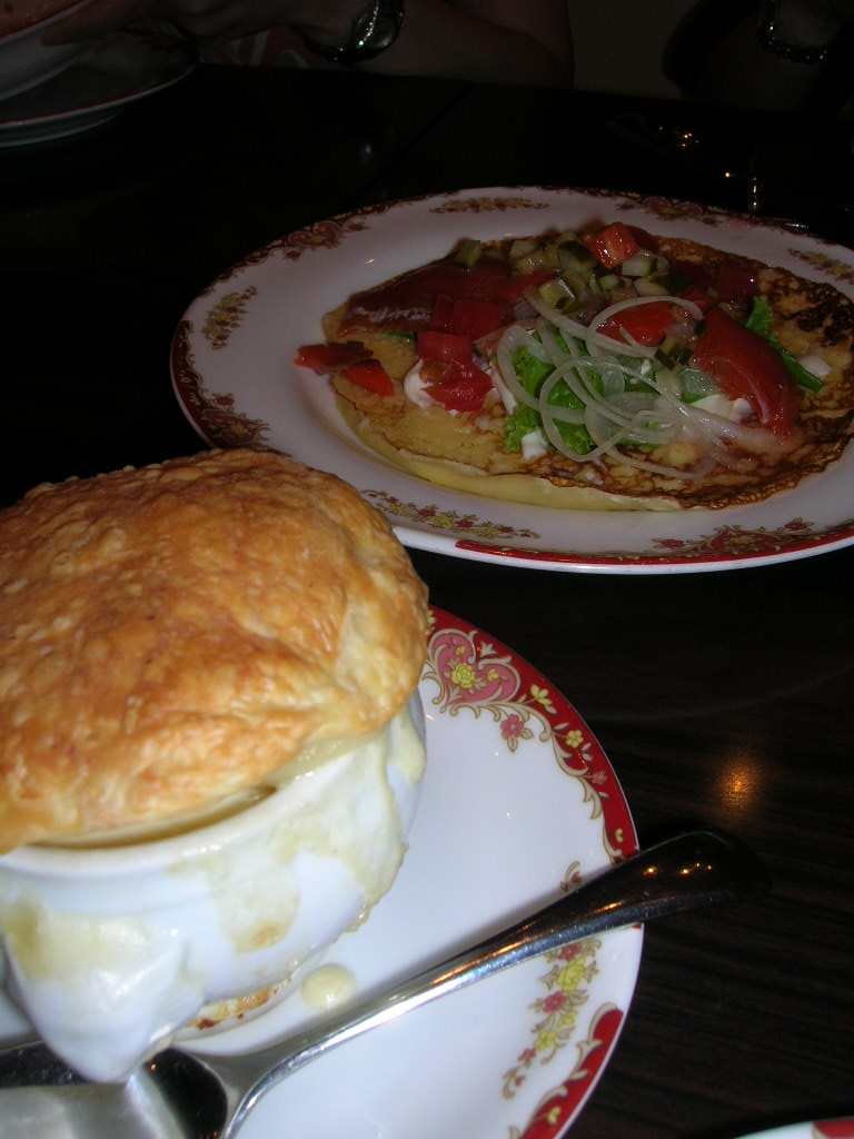 見た目が真っ赤なので酸っぱそうに見えたボルシチはまろやかな味で、野菜がたっぷりで美味しかったです。野菜ピロシキもなかなか。でも、一番美味しかったのはキノコの壺焼きでした。クリームシチューのようななめらかさにたっぷりのマッシュルーム。上にかぶさったパイもさくさく。デザートはコーヒークリームがかかったスポンジケーキでしたが、なにか(シロップ?)がしみていてしっとり。味は蒸しパンのようでした。美味しかった~~。パンケーキの方が盛りつけがきれいでしたが、壺焼きのAセットもなかなか。地下のお店なのに割と混んでいて、お客さんが次々と入ってきました。