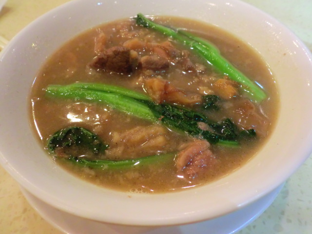 最初、カレーが目に留まりましたが、お店のオジサンに「これ辛い?」と訊いたら、「ちょっとだけね」と返ってきたので、「当てにならない・・・」と思い直し、「スープの麺が食べたいんだけど」と言って、「牛肉と野菜のスープ麺」を勧められ、それにしました。あとはミルクティも頼んでみました。