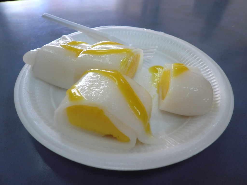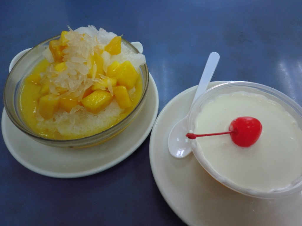 デザートのお店「味香園」。地元ではデザートが人気のようで、種類もたくさんありました。派手なかき氷もたくさんありましたが、食べる勇気がなかったので、私はいつものマンゴープリン(写真左の真っ白の)。マンゴーサゴwithポメロ(柑橘類の名前)というのもありました(写真右)。そして、マンゴーの果肉をもちもちの皮で巻いたマンゴーロール。どれも美味です。