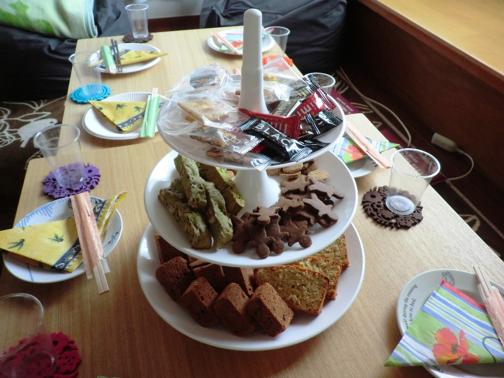 ビールや春雨サラダ、上等なおかき、手作りフルーツケーキ、さらにはタコス、フォアグラ(!)、チーズ&クラッカーなどの差し入れもいただいて、とても華やかなテーブルとなりました。